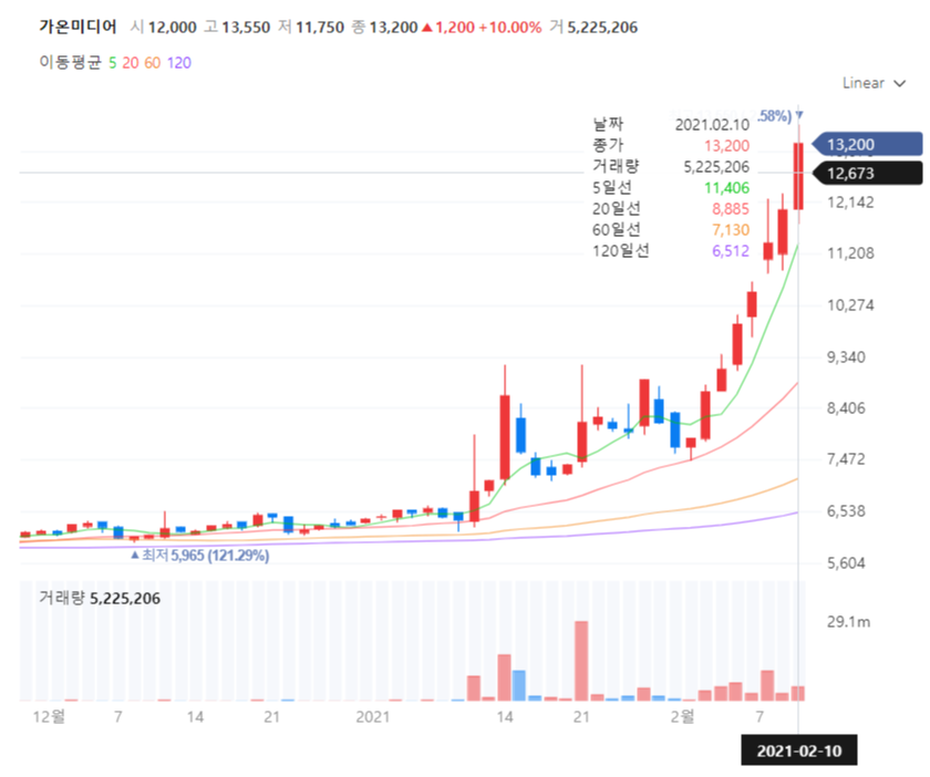 가온미디어(KAON Media)는 코스닥 상장회사다. 시총 약 2천억원으로 코스닥 475위다. 상장주식수는 약 15백만주이다. 21년 1월 12일 종가 6,890 원이었는데 한달 뒤인 2월 10일 종가 13,200 원이다.