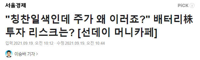 전기차 시장의 전망에 비해 배터리 셀을 생산하는 LG화학(LG에너지솔루션)의 주가는 힘들게 가고 있다. 2021년 9월 19일 올라온 선데이 머니카페에 그 원인을 분석해 놓은 기사가 있다. 배터리 셀 업체에 대한 투자 리스크에는 어떤 것들이 있을까?