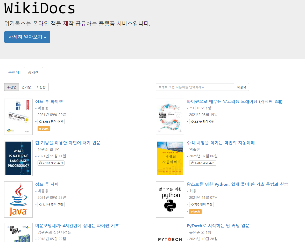 참고로 위키독스는 현재 진행형이다. 작성 중인 책들이 많기 때문에 추천이 많은 책 위주로 보기를 권한다.