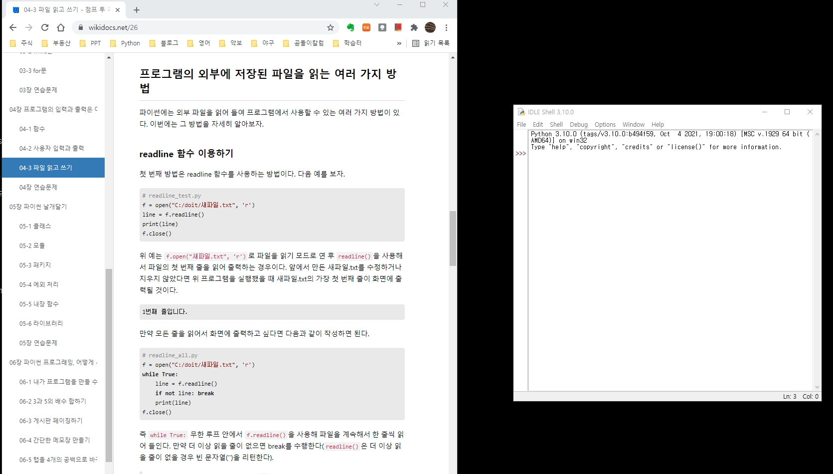책에 있는 예제를 하나씩 입력해보면서 파이썬을 독학하고 있다. 모니터 왼쪽은 전자책, 오른쪽은 IDLE을 띄워 책을 보면서 코드를 입력한다.