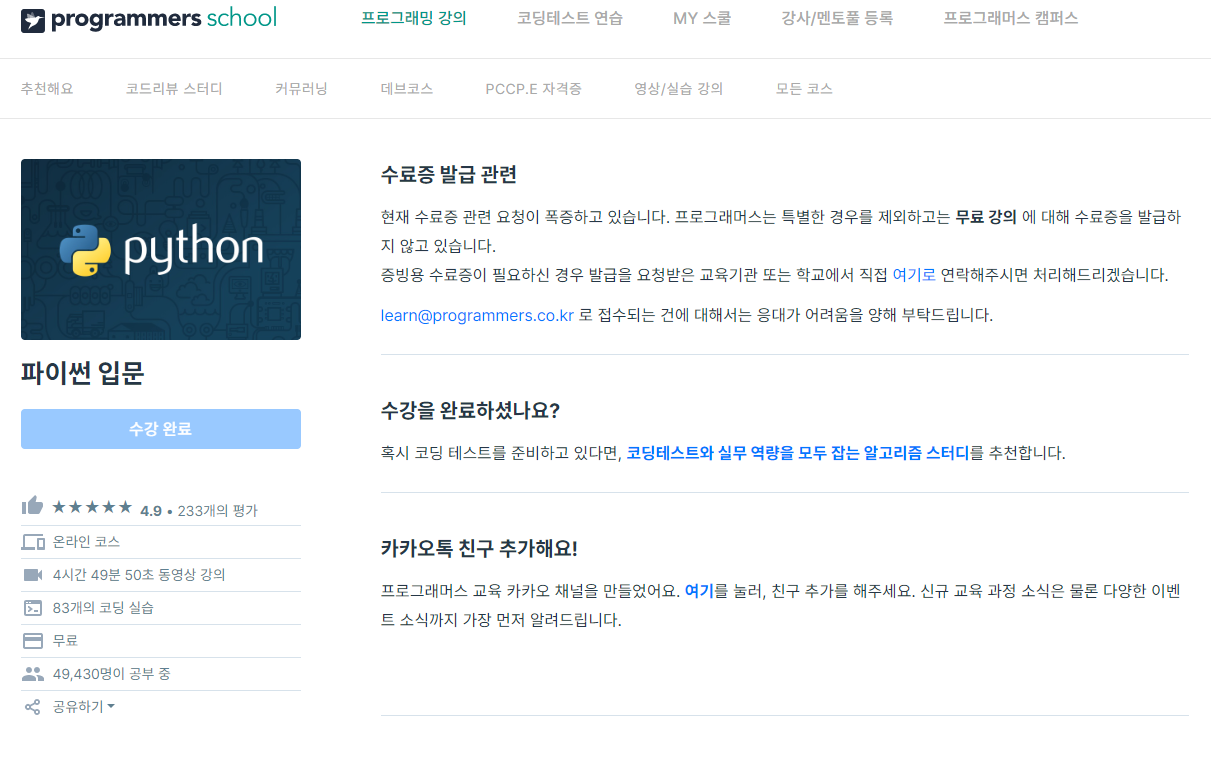 1. 내가 수강 완료한 '파이썬 입문'은 무료 강의다.