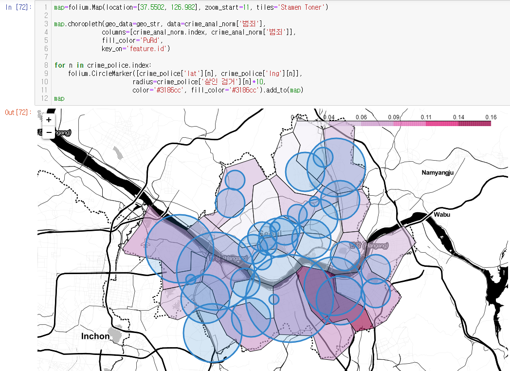 구글 맵스(Google Maps)를 이용해 지도 위에 지역별로 데이터를 나타내는 것도 해볼 수 있다.