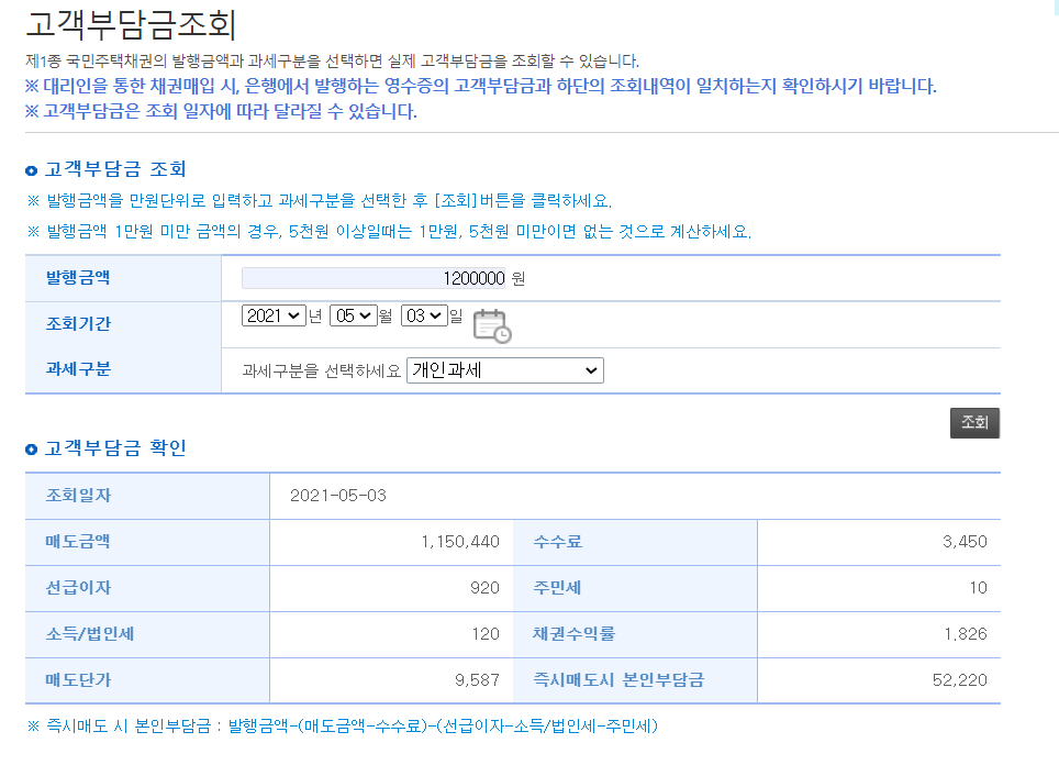 제1종 국민주택채권은 연 1%의 이율로 만기 5년이다. 국민주택채권은 실제로 채권을 구입해서 보관하고 있을 수도 있고, 바로 팔아서 정산해버릴 수도 있다. 전자를 선택하려면 은행에서 대출받을 때 채권을 매입하겠다고 말하면 된다. 그리고 채권을 입고할 증권사 계좌를 준비하면 은행에서 채권을 증권사 계좌로 보내준다. 채권금액이 크지 않고 이율이 낮은 데다가 증권사 계좌까지 준비해야 해서 번거로울 수 있다. 대부분 후자를 선택한다. 방금 구입한 채권을 바로 되파는 형식으로 처리가 된다. 즉시 매도라고 한다. 돈을 받고 팔 거 같지만 그렇지 않다. 오히려 돈을 내고 팔아야 한다. 쉽게 생각하면 내가 방금 산 물건을 다시 팔려고 하는데 그만큼 인기가 없어서 더 싸게 팔아야 하는 상황이다. 100 원주고 샀는데 98 원주고 팔면 결국 2원 손해다. 이 손해만큼 비용을 지불하는 거라고 보면 된다. 채권 이야기는 깊게 들어가면 끝이 없으니 이쯤에서 정리하자.