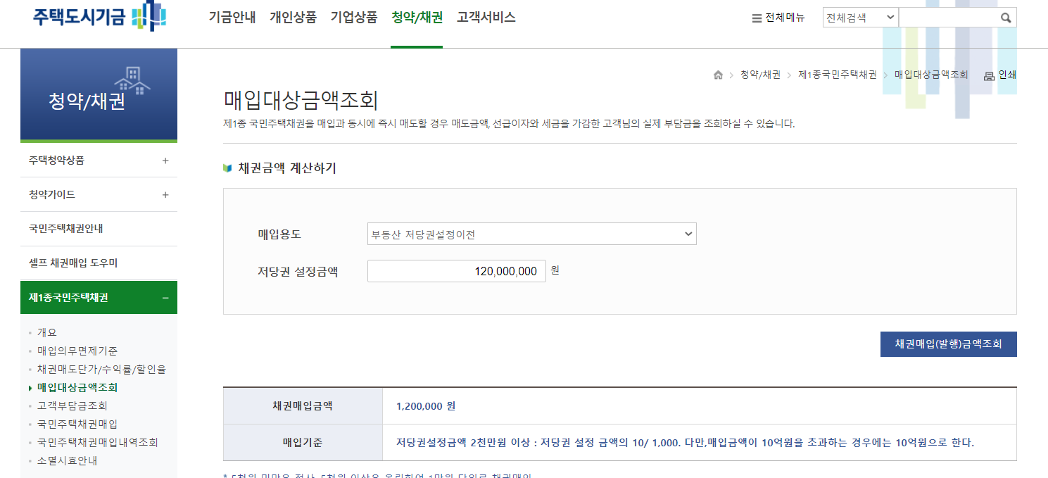그럼 얼마짜리 채권을 구입해야 하며, 즉시 매도 시 얼마를 내야 할까? 주택도시 기금 홈페이지에 가면 알 수 있다.