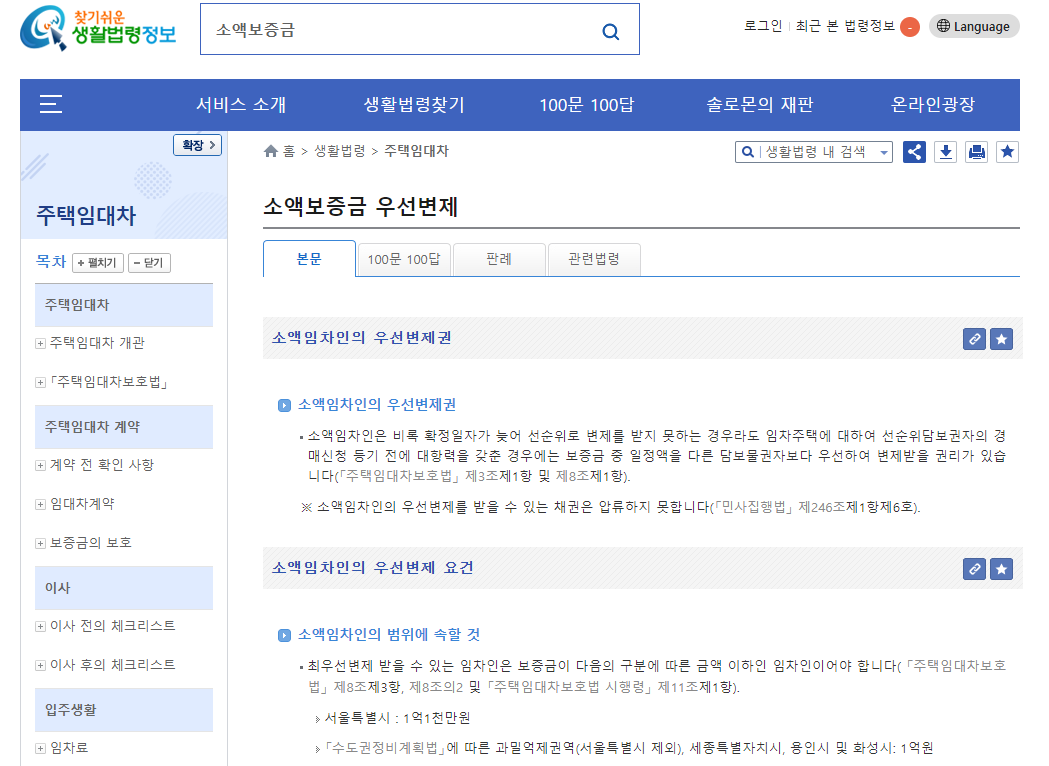 소액임차인이 누구인지 잠시 살펴보자. 검색창에 '찾기쉬운 생활법령정보'를 입력해보자. 법제처에서 운영하는 홈페이지가 나온다. 사이트의 검색창에 '소액보증금'이라고 입력하고 엔터를 눌러보자. '소액보증금 우선변제'라는 글이 나온다.