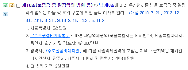 국가법령정보센터 홈페이지로 가서 주택임대차보호법 시행령이라고 검색해보자. 본문 10조에 가면 위 내용을 볼 수 있다. 법에는 최우선변제금이라고 되어 있지는 않고, 보증금 중 우선변제를 받을 수 있는 일정액이라고 표현되어 있다.