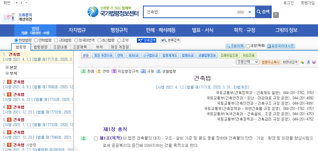 건축물은 건축법에 의해 건축한다. 따라서 건축물의 종류는 건축법에 나와있다. 검색창에 '국가법령정보센터'라고 입력해보자. 국가법령정보센터 홈페이지에서 '건축법'이라고 검색해보자.