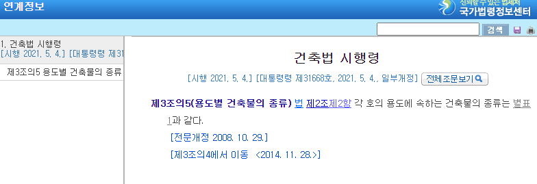단독주택, 공동주택 이라는 용어가 보인다. '... 세부 용도는 대통령령으로 정한다'는 문구에 링크가 있다. 눌러보자. 팝업창이 뜨면서 건축법 시행령이 나온다. 제3조의 5 용도별 건축물의 종류가 보인다.