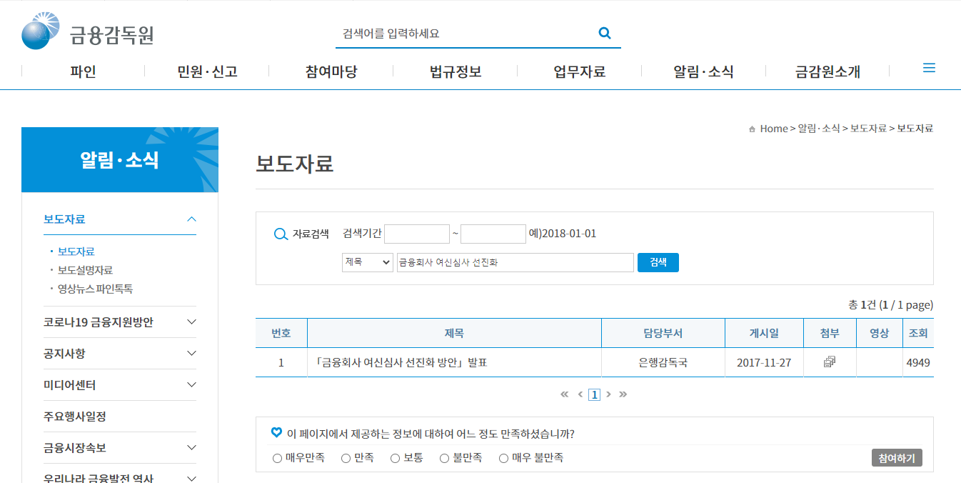 여기로 가서 '금융회사 여신심사 선진화'라고 검색해보자. 2017년 11월 27일에 보도한 자료가 있다. 눌러보자.