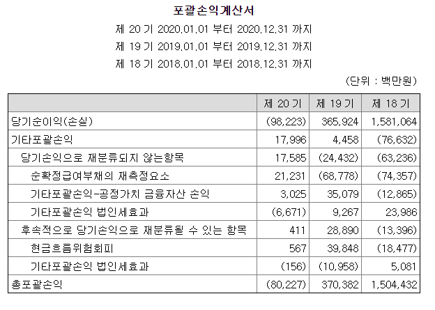 매출부터 시작해서 여러 항목이 가감되고 마지막으로 당기순이익(손실)을 보여준다. 손익계산서 바로 다음으로 나오는 포괄손익계산서를 보자,