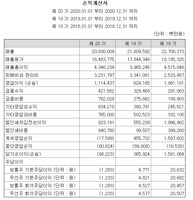 매출부터 시작해서 여러 항목이 가감되고 마지막으로 당기순이익(손실)을 보여준다. 손익계산서 바로 다음으로 나오는 포괄손익계산서를 보자,