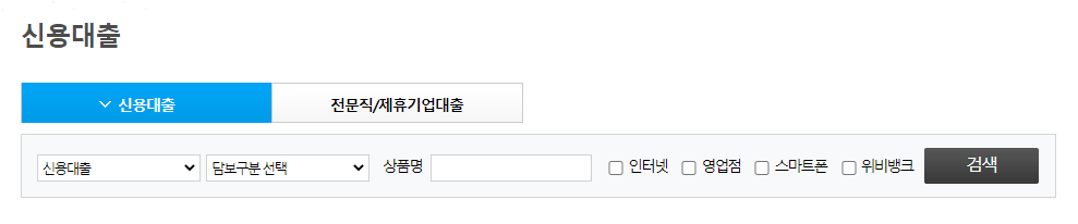 내 연소득의 몇%로 대출한도를 산출할지는 미리 알기 어렵다. 다만 은행은 특정 직업에 대해서는 기계적인 대출한도를 산출한다. 공무원, 교사, 변호사, 검사, 판사, 경찰, 소방공무원, 군인 등등... 내 직업에 맞는 대출 상품이 있는지 먼저 찾아보자. 경우에 따라서는 대출 한도를 연봉의 최대 2배까지도 해준다. 또한 은행은 우량한 기업이라고 판단되면 해당 업체와의 거래를 활성화하기 위해 유리한 대출조건을 제시한다. 내가 다니는 회사가 어떤 은행과 유리한 대출 조건이 협약되어 있는지 알아보는 것도 도움이 된다. 아래는 우리은행의 홈페이지에서 신용대출 메뉴를 선택한 화면의 일부이다. 전문직과 제휴 기업대출이 일반 신용대출과 구분되어 있는 것을 볼 수 있다. 그럼 개인사업자는? 이 부분에서는 해당되는 게 별로 없다.