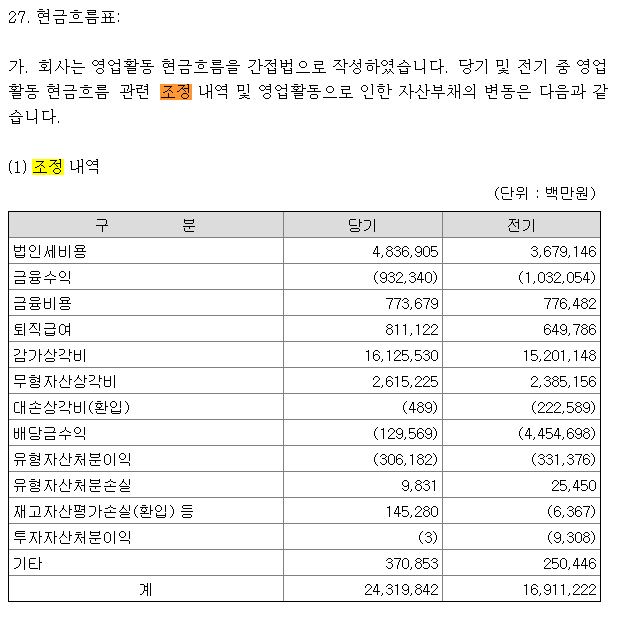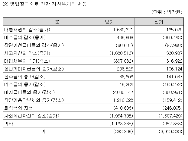 마찬가지로 주석을 보면 영업활동으로 인한 자산부채의 변동 내역을 볼 수 있다.
