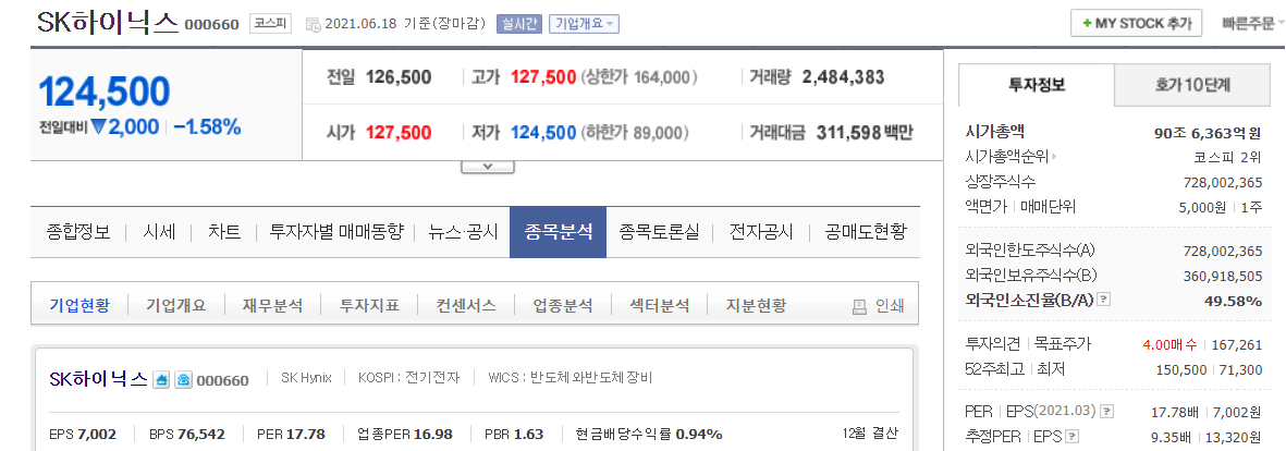 네이버 증권으로 가서 SK하이닉스를 검색해보자. 종목분석 카테고리로 가면 원하는 값을 찾아볼 수 있다.