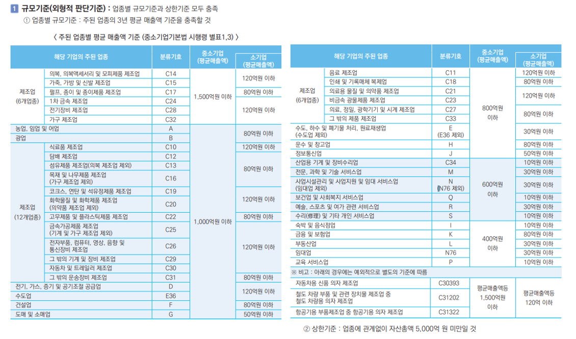 중소기업기본법에 의해 중기업과 소기업을 구분한다. 매출액 기준으로 분류하자면 다음 표와 같다. 단, 규모 기준과 독립성 기준을 모두 충족해야 하므로 매출액만을 갖고 구분하지 않는다는 것만 알아두자. 업종에 관계없이 자산 총액이 5천억 미만이어야 한다. 자산총액 5천억 이상이면 중견기업에 속한다.