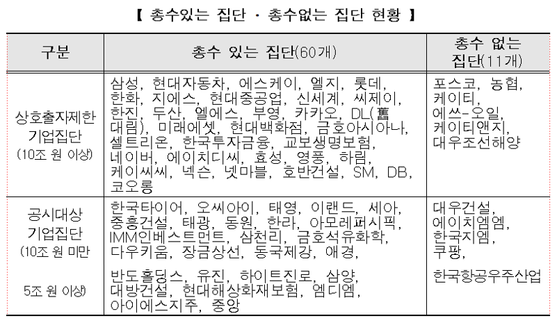 자산총액 5조 원 이상인 71개 기업집단(소속회사 2,612개)을 공시대상 기업집단으로 지정했고, 이 중에서 자산총액 10조원 이상인 40개 집단(소속회사 1,742개)을 상호출자제한기업집단으로 지정했다.